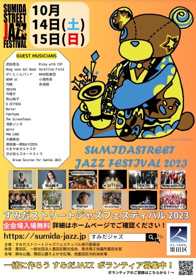 すみだストリートジャズフェスティバル2023(Happy Fragrance Duo [Original/Jazz]) すみだストリートジャズフェスティバル2023(Happy Fragrance Duo [Original/Jazz]) 2023/10/15(日) start 12:20- (演奏は30分程度・雨天中止) 観覧無料(投げ銭あり) place : JR錦糸町駅北口前アルカイースト @墨田区 https://sumida-jazz.jp/sj/ No Data
